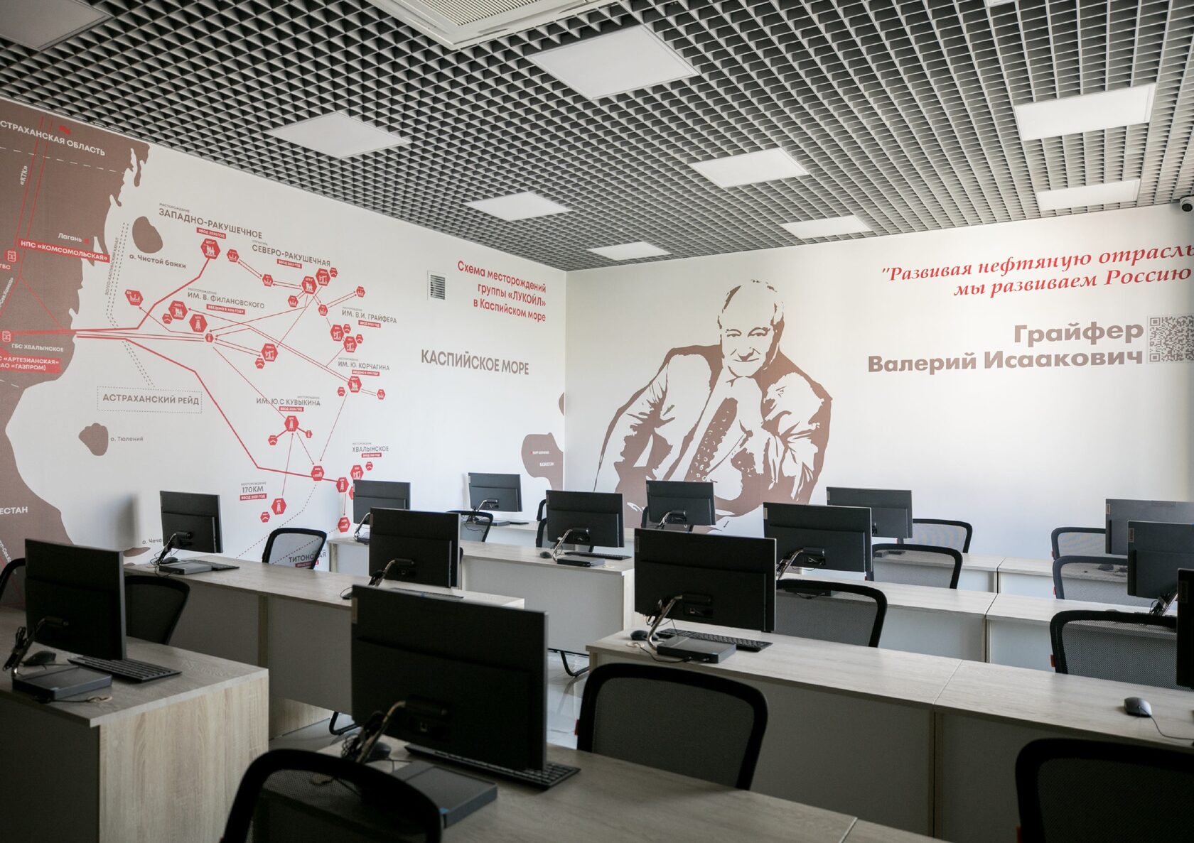 Основным пожеланием заказчика было создание эргономичных, функциональных и интересных пространств для преподавательского состава и студентов с учетом фирменного стиля ПАО Лукойл в дизайн-проекте.